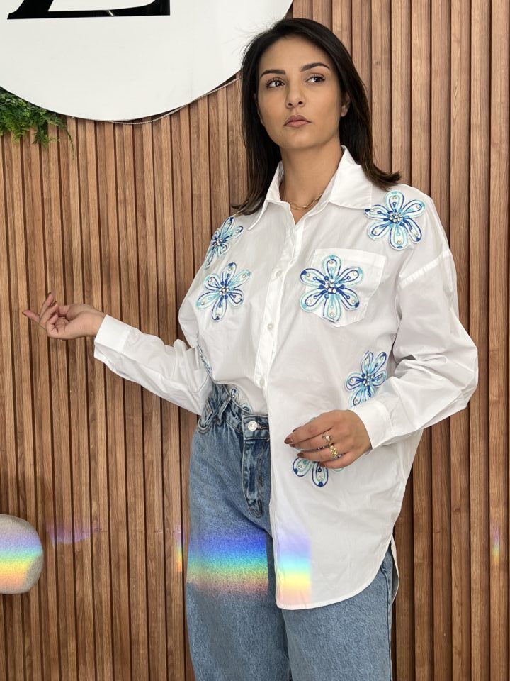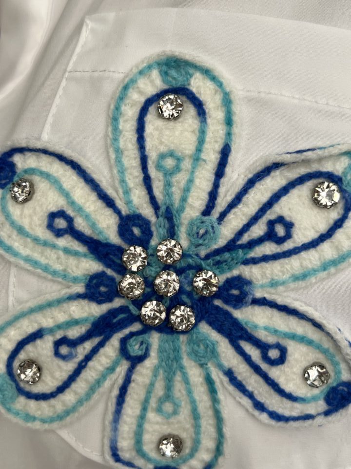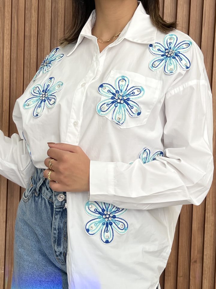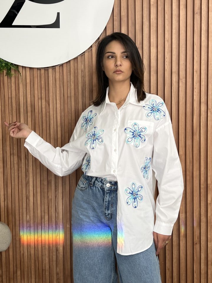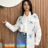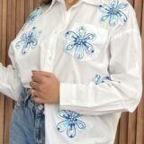 This crisp white cotton shirt is redefined by its stunning, intricate detailing, making it a true standout piece for any casual or dressy occasion..
