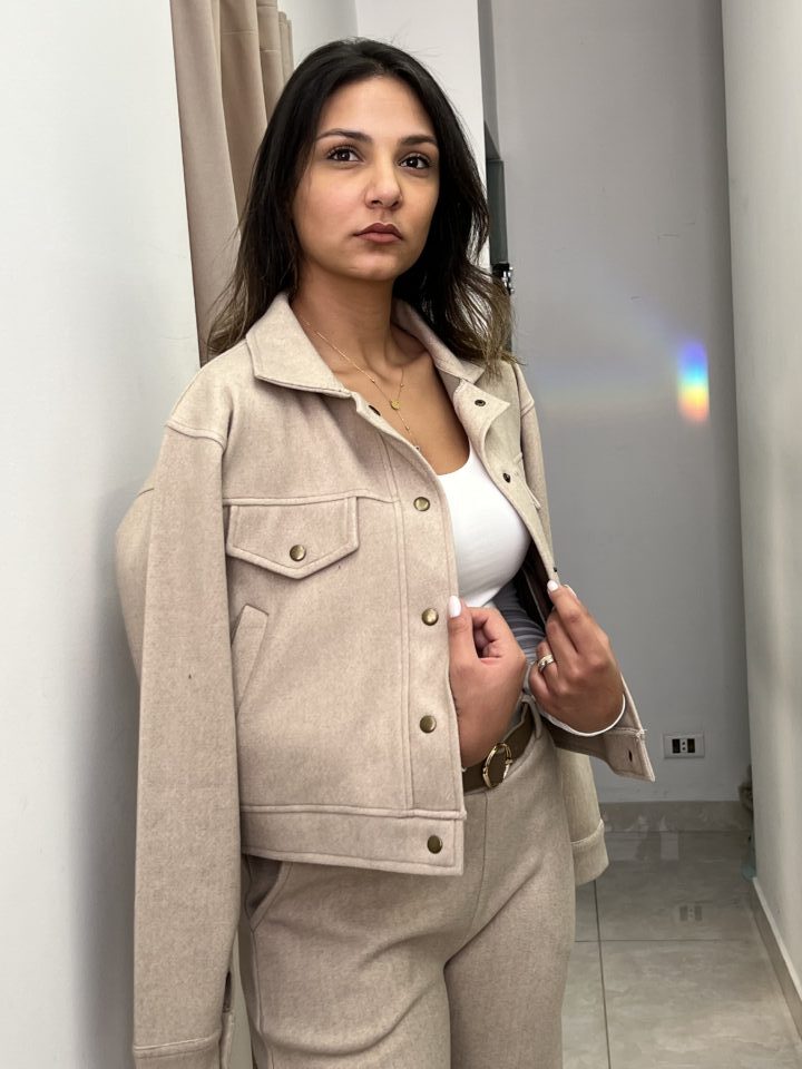 This jacket is cut from a beautifully textured, mid-weight gray fabric (like a fine tweed, herringbone, or soft wool blend), giving it a refined look and feel. It’s the perfect layering piece that moves effortlessly from the office to the weekend.