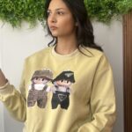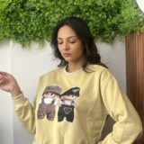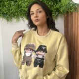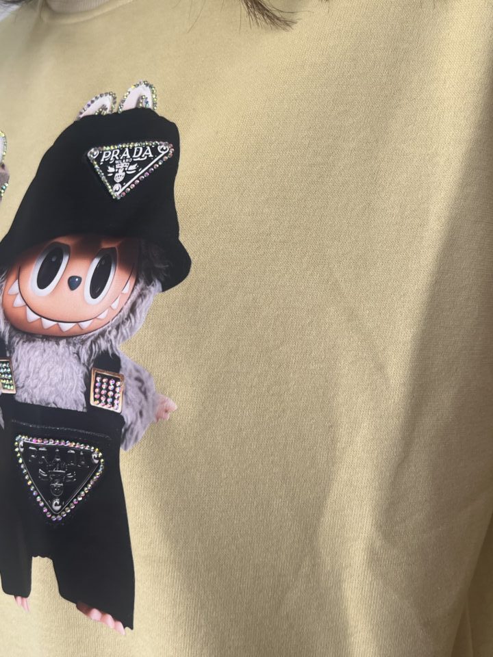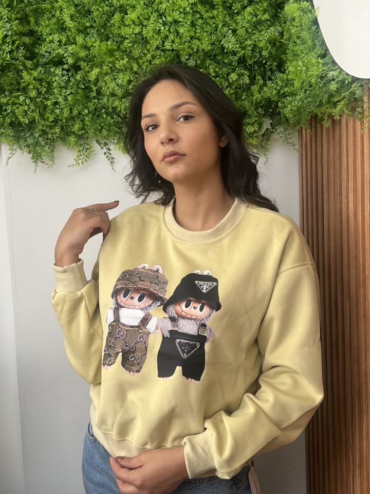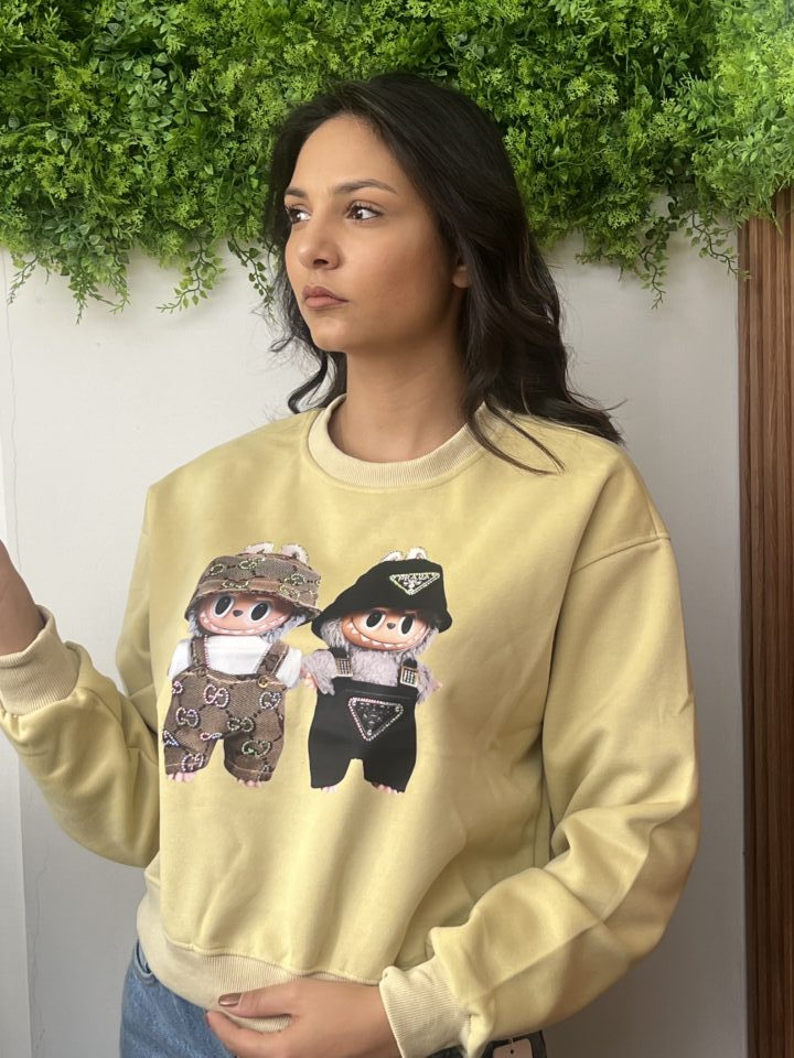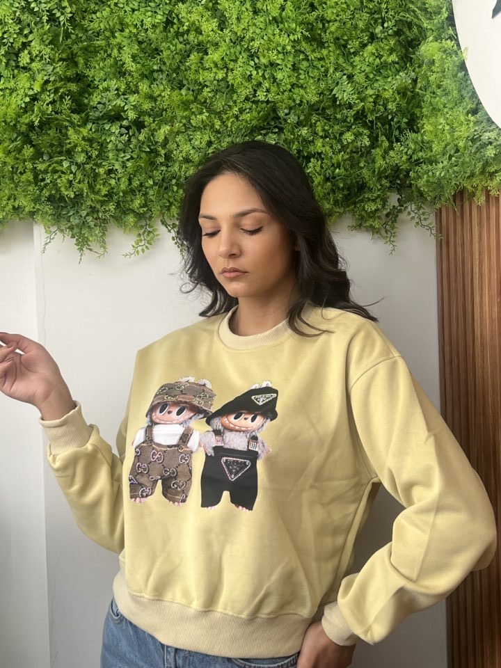 Get ready to turn heads with our Designer Doll Crewneck! This crisp, white sweatshirt features an oversized print of two adorable, yet seriously stylish, doll characters sporting popular luxury brand-inspired outfits and bucket hats.