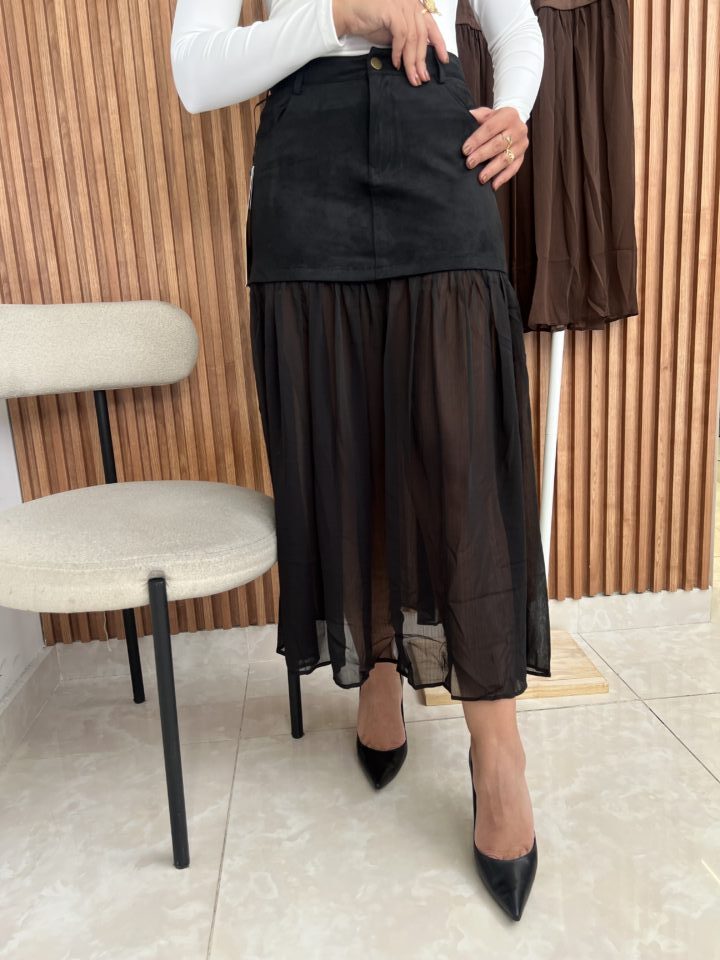 Embrace luxurious texture and ethereal movement with this stunning two-in-one design. This high-waist skirt masterfully contrasts rich, soft velvet with light, flowing tulle for a look that is both grounded and dreamy.