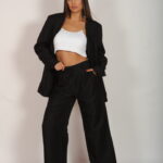 This ensemble combines the oversized, relaxed fit blazer with the wide-leg trousers, featuring that distinctive contrast white waistband detail.