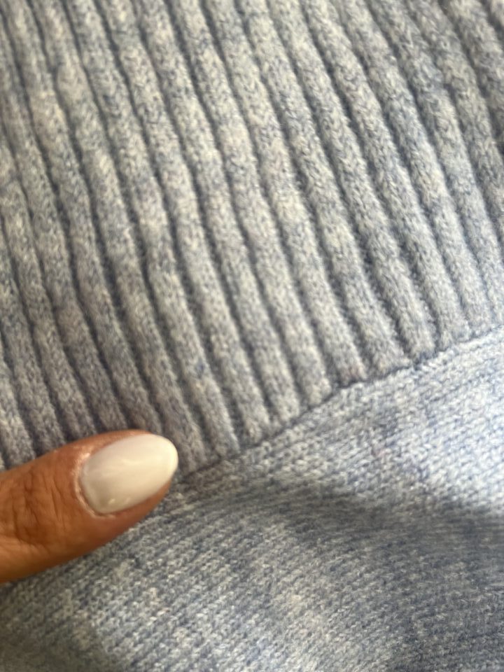 The soft, breathable knit provides ideal warmth, making it a dream to layer over both neutral basics and patterned tops. Perfect for adding a peaceful pop of color to your cooler-weather wardrobe.